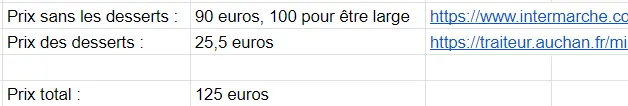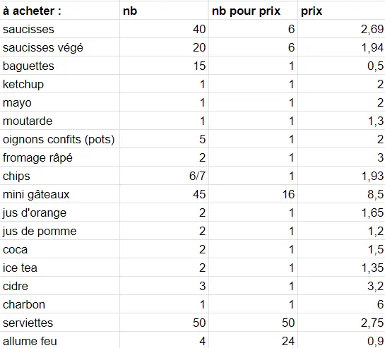 Voici une liste de course prévisionnelle avec les prix à l'unité lorsque cela est possible :