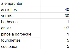 Voici une première liste des choses à emprunter auprès du Bar'bu, de l'UA ou d'ISF :
